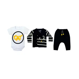 سه تیکه نوزادی برند بیبی وان طرح گربه مشکی جنس نخ پنبه نرم سایز نوزادی تا 18 ماه شامل بادی شلوار و بلوز جلو دکمهناموجود
