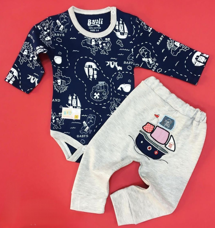 ست لباس نوزادی دو تکه بیبی وان مدل باولی | بادی و شلوار طرح گنج | سایز ۳ تا ۱۸ ماه