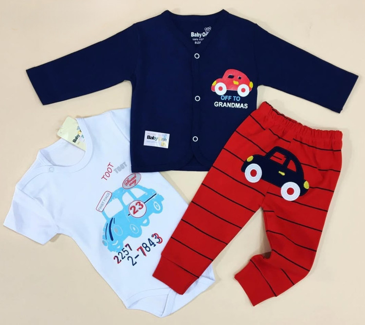 سه تیکه نوزادی برند بیبی وان طرح ماشین جنس نخ پنبه نرم سایز نوزادی تا 18 ماه شامل بادی شلوار و بلوز جلو دکمه