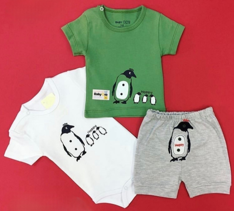 سه تیکه نوزادی برند بیبی وان طرح پنگوئن سبز جنس نخ پنبه نرم سایز نوزادی تا 18 ماه شامل بادی شلوارک و تیشرت