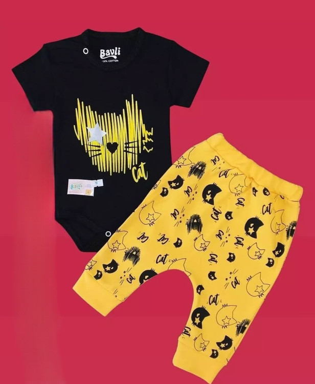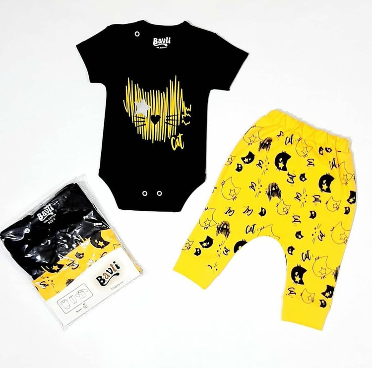 ست لباس نوزادی دو تکه بیبی وان مدل باولی | بادی و شلوار طرح گربهای آستین کوتاه