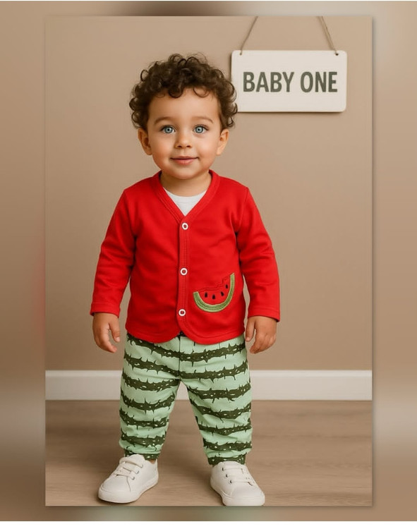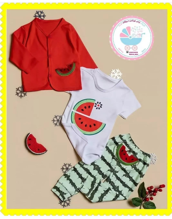 خرید سه تیکه بی بی وان baby one طرح یلدایی شامل بادی شلوار کت از جنس نخ پنبه نرم و ضد حساسیت