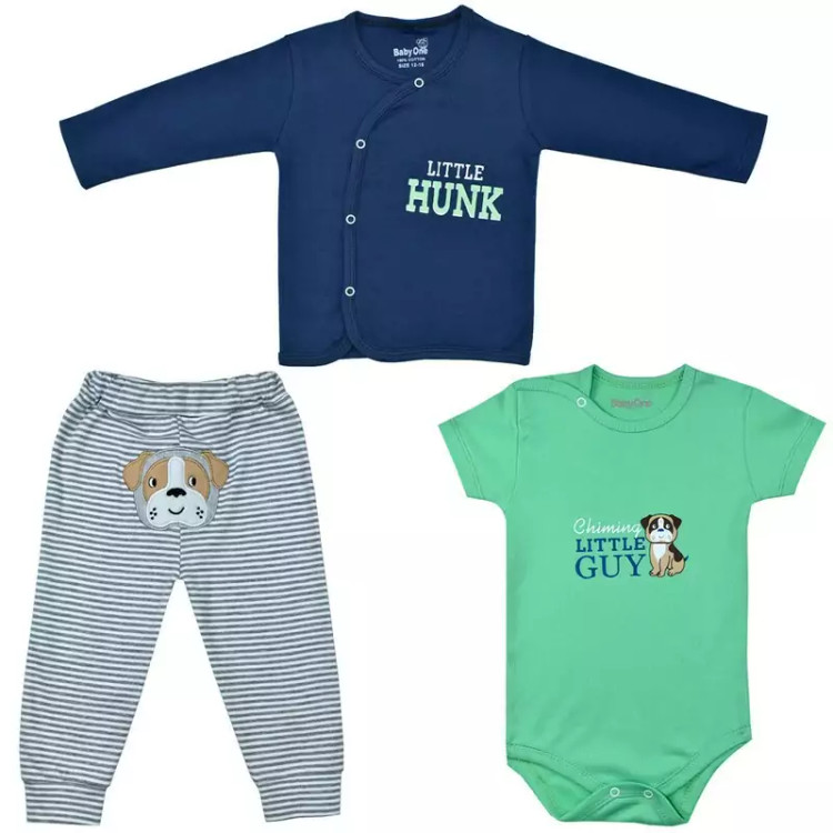 سه تیکه نوزادی برند بیبی وان طرح هانک جنس نخ پنبه نرم سایز نوزادی تا 18 ماه شامل بادی شلوار و بلوز جلو دکمه