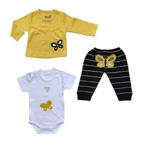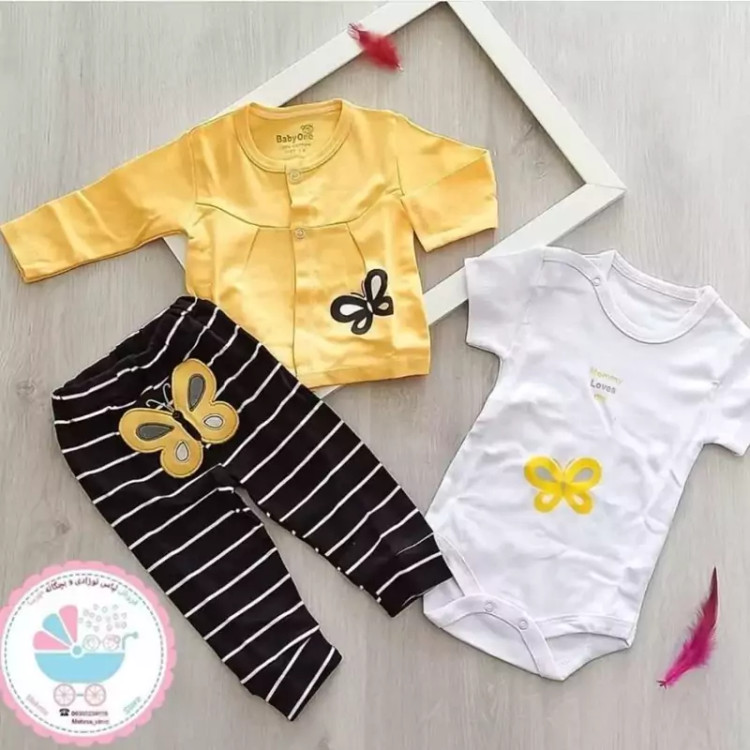 سه تیکه نوزادی برند بیبی وان طرح پروانه زرد جنس نخ پنبه نرم سایز نوزادی تا 18 ماه شامل بادی شلوار و بلوز جلو دکمه