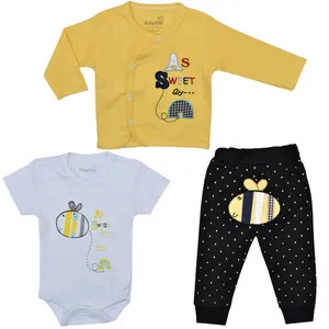 سه تیکه نوزادی برند بیبی وان طرح زنبور جنس نخ پنبه نرم سایز نوزادی تا 18 ماه شامل بادی شلوار و بلوز جلو دکمه