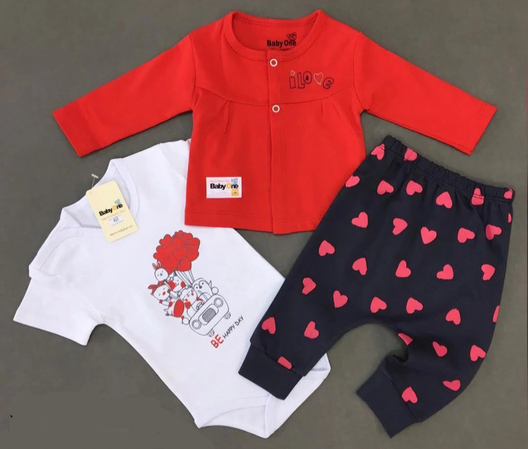 سه تیکه نوزادی برند بیبی وان طرح گل قرمز جنس نخ پنبه نرم سایز نوزادی تا 18 ماه شامل بادی شلوار و بلوز جلو دکمه